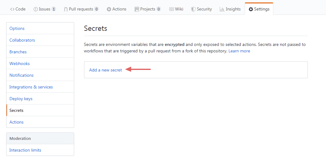 To add a secret env variable to your GitHub repo go to your repo settings and you'll see a secrets tab like this and